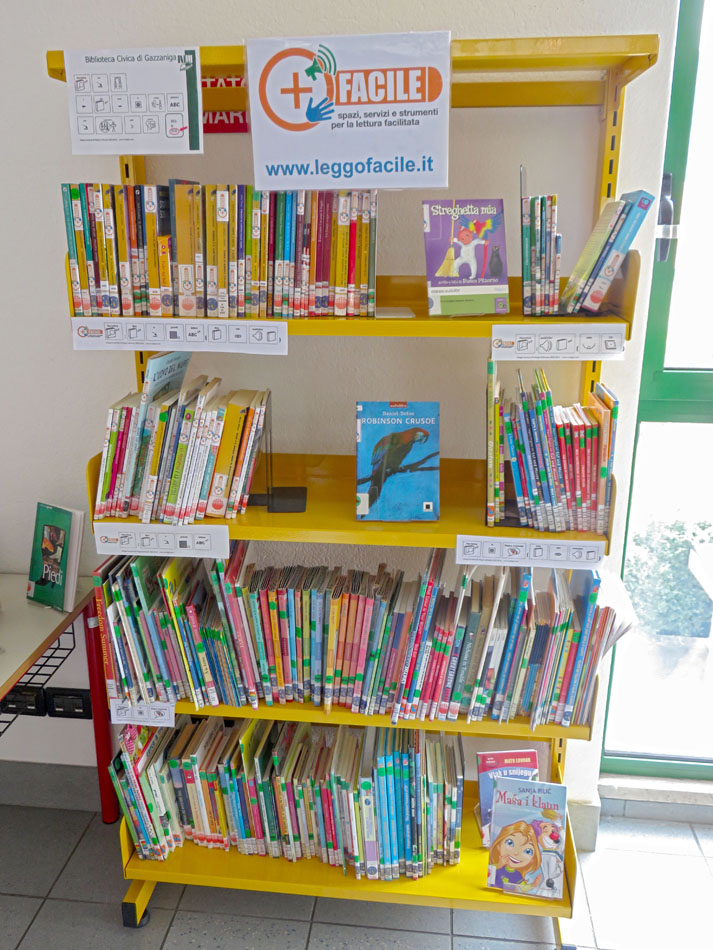 “Investire” in una biblioteca significa anche essere attenti alle novità del settore ed essere pronti a recepirle; da aprile 2016 i documenti inerenti la letteratura hanno un nuovo codice internazionale che tiene conto della produzione letteraria del XXI secolo, con conseguente dislocazione delle opere di uno stesso autore in punti diversi di una biblioteca. Per aiutare gli utenti ad orientarsi tra i tanti scaffali e trovare facilmente le opere di loro interesse, lo scorso aprile la sezione adulti di letteratura è stata interamente riorganizzata; con il fondamentale contributo dell’Associazione Alpini di Gazzaniga e di alcuni volontari, sono stati ricollocati in ordine alfabetico per cognome dell’autore circa 12.000 volumi e sono state create le relative sezioni speciali (narrativa, teatro, poesia, critica letteraria, classici greci e latini, libri in lingua originale, libri a grandi caratteri, libri con relativo audiolibro, libri con font specifico per utenti con bisogni educativi speciali). Anche la segnaletica è stata interamente rifatta con i simboli WLS utilizzati dalla CAA (Comunicazione Aumentativa Alternativa), in continuità quindi con il progetto sulla CAA avviato nel 2013 in collaborazione con la Neuropsichiatria Infantile dell’Ospedale “ Briolini” di Gazzaniga. Da allora sono molte le iniziative attuate tra cui: