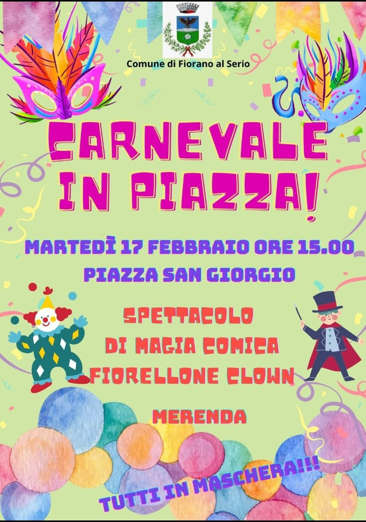 Il Carnevale poi, diventa un’occasione speciale per condividere lo spazio del sagrato della chiesa di Fiorano al Serio, e stare insieme in compagnia. Una festa pensata per i più piccoli, ma aperta davvero a tutti, dove il divertimento non mancherà. Protagonista dell’evento sarà Fiorellone, che saprà stupire grandi e bambini con giochi di magia e momenti di animazione. Sarà un pomeriggio dedicato al condividere e al fare festa come comunità. A rendere ancora tutto più piacevole ci sarà una merenda per tutti, grazie alla preziosa collaborazione dei volontari civici. Vi aspettiamo in piazza, in maschera o senza, martedì 17 febbraio alle ore 15: portate sorrisi, voglia di stare insieme e tanta allegria.