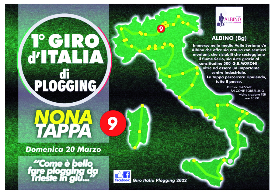 Il Giro d’Italia di “Plogging” è cominciato il 23 gennaio a Pordenone e si chiuderà il 27 novembre a Cagliari, coinvolgendo ogni fine settimana città e territori diversi. Albino sarà protagonista della nona tappa, domenica 20 marzo, per merito e con l’organizzazione del gruppo “Puliamo Albino”.