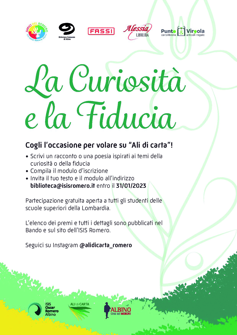 Curiosità e fiducia. Questi i due temi che sono l’oggetto della Terza edizione del concorso letterario “Ali di carta”, promosso da “Librarium”, la biblioteca scolastica dell’Isis “O.Romero” di Albino, in collaborazione con il Comune di Albino. Un’occasione creativa per permettere agli studenti delle scuole superiori della Lombardia di esprimere se stessi, mediante le forme del racconto e della poesia.