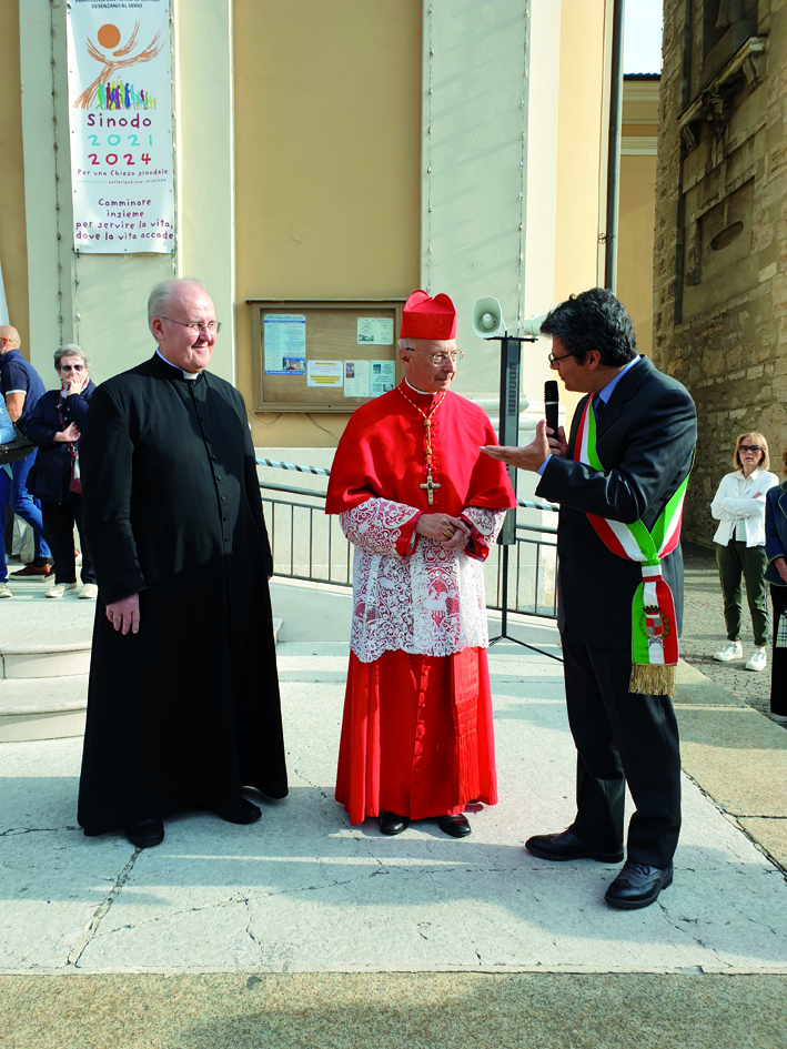 La festa mariana si è chiusa domenica 15 ottobre con la celebrazione del 165° anniversario dell’Incoronazione dell’effige della Madonna, avvenuta il 10 ottobre 1858, ad opera del vescovo di Lodi mons. Gaetano Benaglia. Fra le tante Messe, una si è rivelata molto particolare, quella delle 10.30, che ha visto la presenza del Card. Angelo Bagnasco, arcivescovo emerito di Genova e presidente della Conferenza Episcopale Italiana (CEI) dal 2007 al 2017. Nessuno di Desenzano al Serio ha voluto mancare. La comunità parrocchiale era tutta lì, sul sagrato del santuario, insieme al sindaco Fabio Terzi, all’assessore allo Sport e Politiche Giovanili Emanuela Testa, al Comandante della Stazione dei Carabinieri di Albino Mar. A. s. UPS Francesco Chiofalo, al Comandante della Polizia Locale Roberto Tisi, per salutare e applaudire l’alto prelato, che ha accolto l’invito del parroco don Ettore Galbusera, per presiedere il Solenne Pontificale.