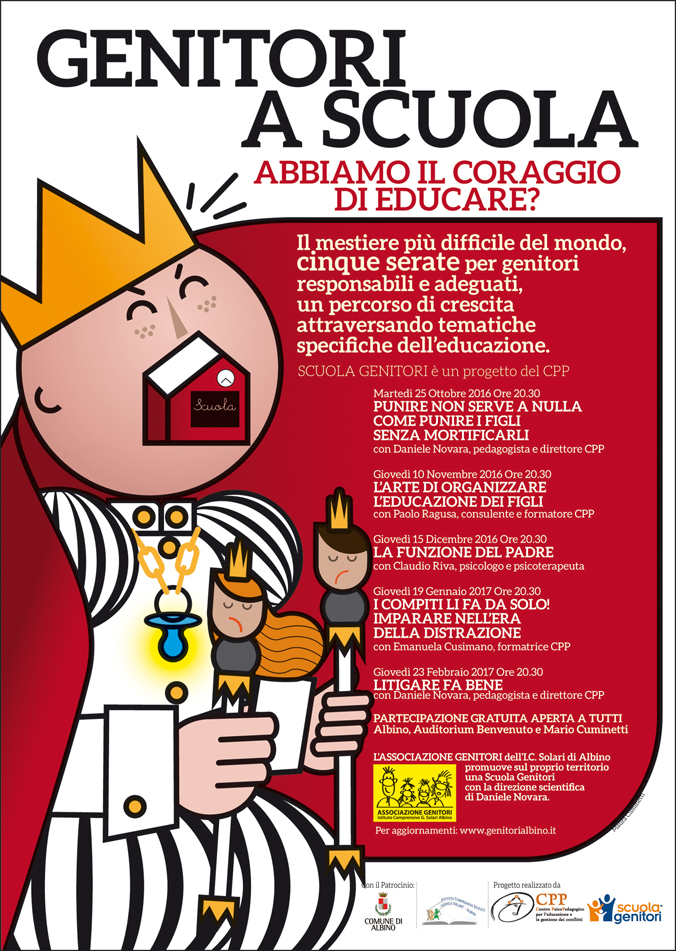 I genitori di Albino ritornano a scuola. Non per migliorare le conoscenze tecniche o specifiche di certe discipline, ma per potenziare le strategie educative e le competenze genitoriali. Protagonista è l’Associazione Genitori dell’Istituto Comprensivo “Gioele Solari” di Albino che, nell’ambito del progetto “La Scuola Genitori, avviato ormai da cinque anni in collaborazione con il CPP (Centro Psico Pedagogico per l’educazione e la gestione dei conflitti) di Daniele Novara, ha organizzato una serie di incontri, dal titolo “Abbiamo il coraggio di educare”, che punta ad accompagnare i genitori nel loro difficile compito, offrendo le basi educative essenziali e indispensabili per una buona crescita dei propri figli. Obiettivo: far sentire i genitori meno soli, dando loro la possibilità di confrontarsi con esperti nel campo dell’educazione, di esprimere dubbi e opinioni, di condividere esperienze e riflessioni sulla realtà che li circonda.