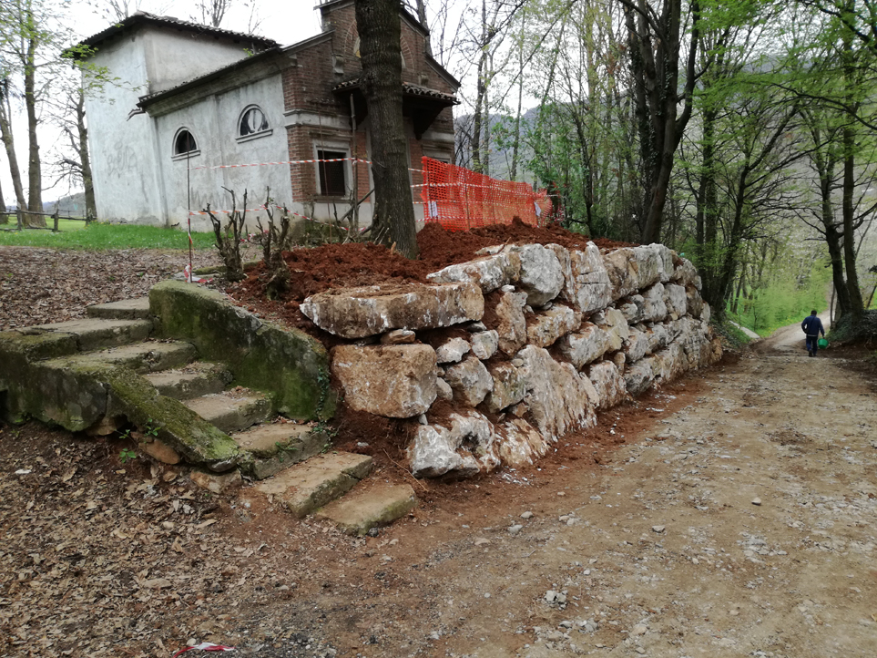 E i contributi sono arrivati, grazie ai primi sostenitori che hanno già fatto donazioni sul conto corrente aperto appositamente per il progetto. Così, nelle corse settimane sono iniziati i lavori di ristrutturazione, che hanno riguardato il muro perimetrale della chiesetta, cioè il muro di cinta, che era pericolante e in stato di profondo degrado, tanto da essere a rischio per gli escursionisti che si transitano: è stato demolito e, al suo posto, è stata inserita una robusta scogliera di massi, che si appoggia all’antica scalinata. Poi, è stata sistemata l’area verde che sta davanti alla chiesetta, con nuova terra che, a breve, riceverà inerbimento e piantumazione.