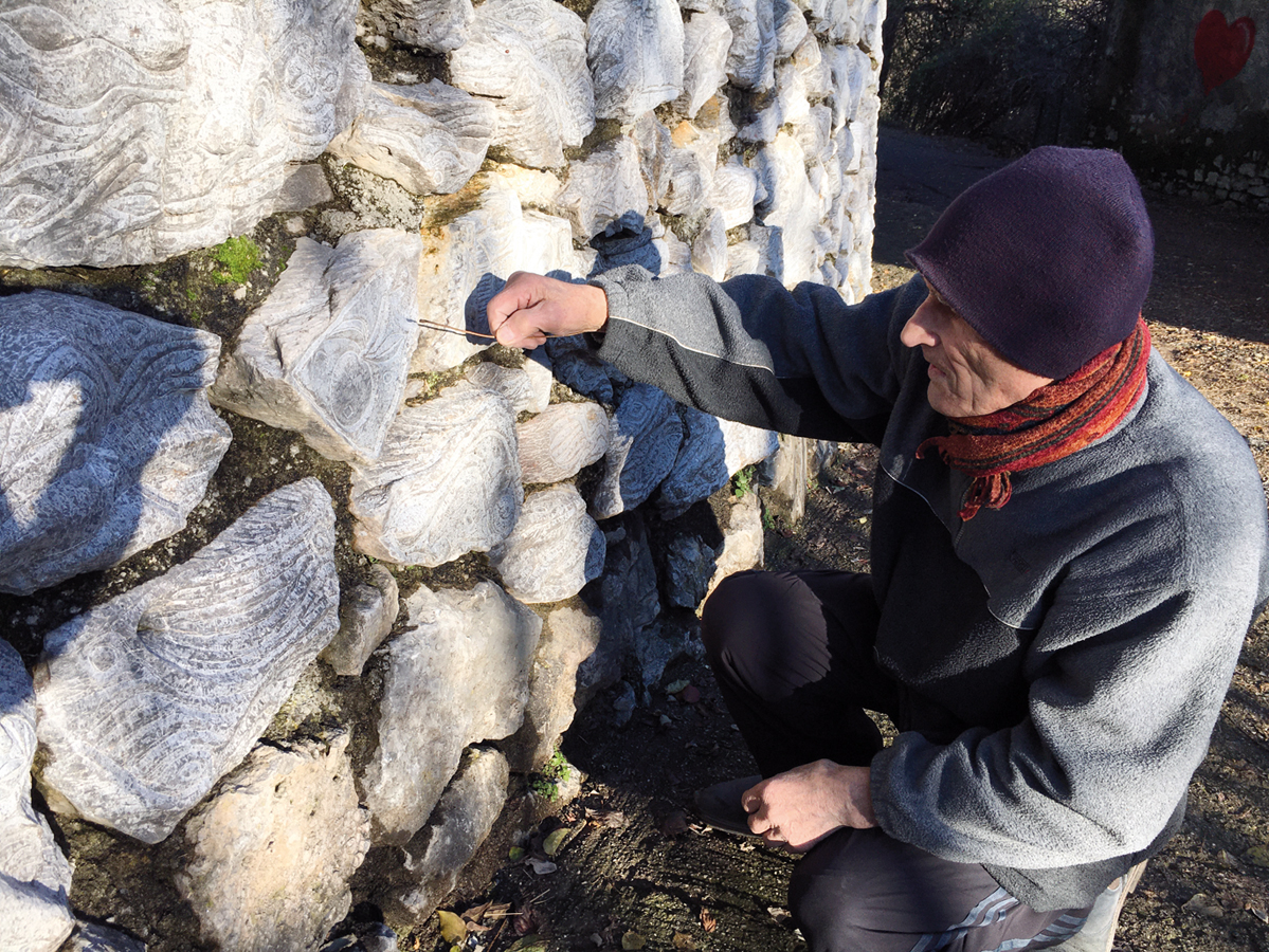 La via delle pietre è un luogo d’incontro e di emozioni: un’antica via nella campagna di Piazzo e un muro di circa trentacinque metri, interamente costituito da pietre scolpite. Un progetto iniziato il 13 settembre 2013, quando l’artista, sentendosi ispirato, decise di rendere un muro anonimo un’opera d’arte da regalare a tutti. Da allora e quasi fino all’ultimo, trascorse in quel luogo intere giornate, lasciandosi ispirare dalle pietre dando così espressione a una creatività innata, nonché forma alle sue profonde emozioni. «Per scolpire una roccia può impiegare un’ora così come tre giorni – come scritto nella piccola guida redatta nel 2021 dagli studenti del Romero in un progetto di alternanza scuola lavoro -, ma per lui questo non ha importanza, poiché quando scolpisce perde la cognizione del tempo, “che sembra volare”». Gli strumenti da lui utilizzati sono stati, oltre a occhiali e guanti di protezione, un martellino e uno scalpello di sua manifattura che possedeva sin dalla giovinezza.