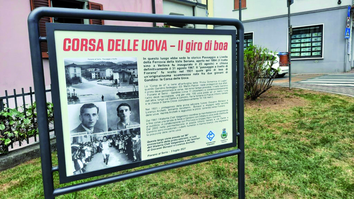 Per la cronaca, quattro anni fa, il 3 luglio 2021, sabato 3 luglio, al giro di boa della “Corsa delle uova” è stata inaugurata una stele commemorativa, che ricorda proprio “il giro di boa” del corridore in prossimità di quello che fino al 31 agosto 1967 fu il passaggio a livello della ferrovia di Valle Seriana, poi dismessa.