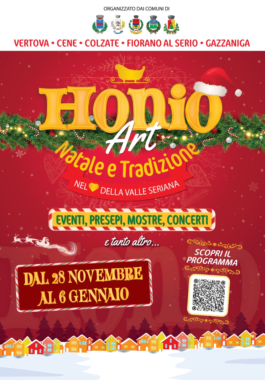 Dal 28 novembre ha preso il via, e resterà attivo fino al 6 gennaio, HonioArt, il nuovo progetto dedicato alle tradizioni natalizie, alla cultura e alla valorizzazione dei borghi della Media Valle Seriana. Un calendario condiviso che unisce i Comuni di Vertova, Cene, Colzate, Fiorano al Serio e Gazzaniga, ispirandosi alla storica Confederazione di Honio, che per secoli ha rappresentato un modello di collaborazione e solidarietà territoriale.