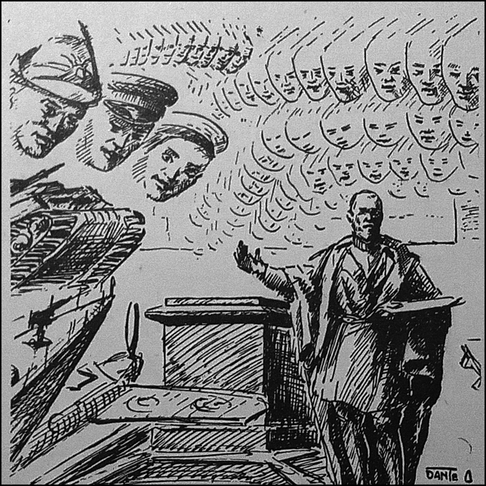 Il disegno del pittore albinese Dante Acerbis (1916-2004) è una rarità: fu pubblicato, 70 anni fa, solo in formato 6×6 cm. e mai più riprodotto. Eppure, coglie lo spirito della generazione albinese uscita dalla Seconda Guerra mondiale, che nel 1954, 70 anni fa appunto, decise, con un referendum in Albino centro, la realizzazione del Monumento ai Caduti e il conseguente allontanamento della statua del Moroni, che nel 1939 era stata posta nella piazza antistante le scuole elementari.