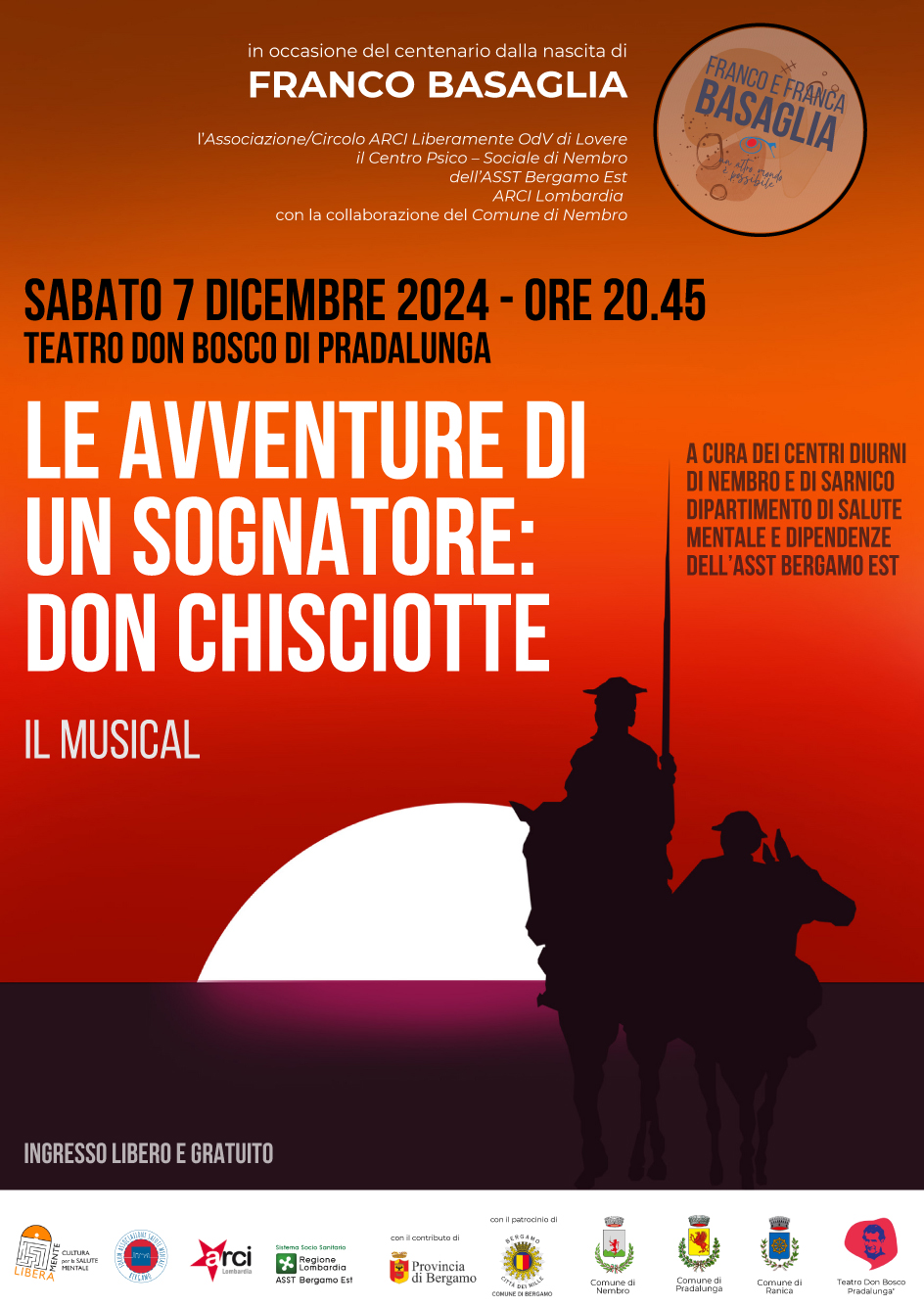 A chiusura di questo ciclo di iniziative che ha coinvolto utenti e operatori del Dipartimento di Salute Mentale dell’ASST Bergamo Est insieme a Circolo ARCI “Liberamente OdV di Lovere ideatore del progetto, ARCI Lombardia, Comuni di Nembro, Ranica, Pradalunga e Bergamo, Accademia di Belle Arti di Bergamo, si inserisce la serata del musical “Le avventure di un sognatore: Don Chiscotte” liberamente adattato dal famoso romanzo di Miguel de Cervantes, in scena il prossimo 7 dicembre al teatro Don Bosco di Pradalunga.